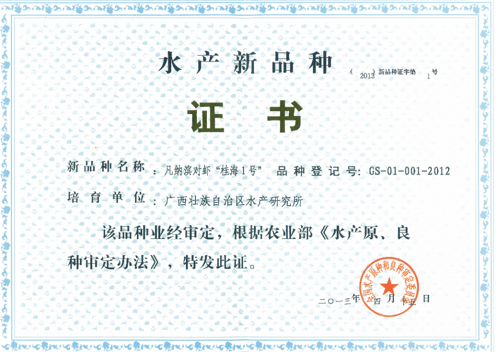 该品种以从美国引进的凡纳滨对虾选育群体为基础群,采用家系选育技术以 90 日龄个体重和养殖成活率为选育指标,经连续5个世代选育而成的高产新品种,该品种具有生长速度快,尤其养殖60天后生长速度显著快于“进口1代苗”,适合于大规格对虾养殖,养殖成活率和成功率高,以及养成规格均匀性好等养殖特性。适合热带、亚热带广大海水及咸淡水区域养殖,适宜养殖盐度在0.5‰-45‰,适宜养殖水温22-35℃。