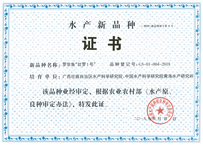 该品种以2003年从国家级青岛罗非鱼良种场引进的吉富罗非鱼后代为基础群体,以抗病性和生长速度为目标性状,采用家系选育技术,经连续4代选育而成的新品种。在相同养殖条件下,与普通吉富罗非鱼相比罗非鱼“壮罗1号”抗无乳链球菌侵染能力平均提高25.57%,养殖成活率平均提高19.19%,生长速度平均提高12.06%。目前已在我国罗非鱼主产区广西、广东、海南、云南以及越南等国家和地区推广养殖,取得了良好的社会效益和经济效益。