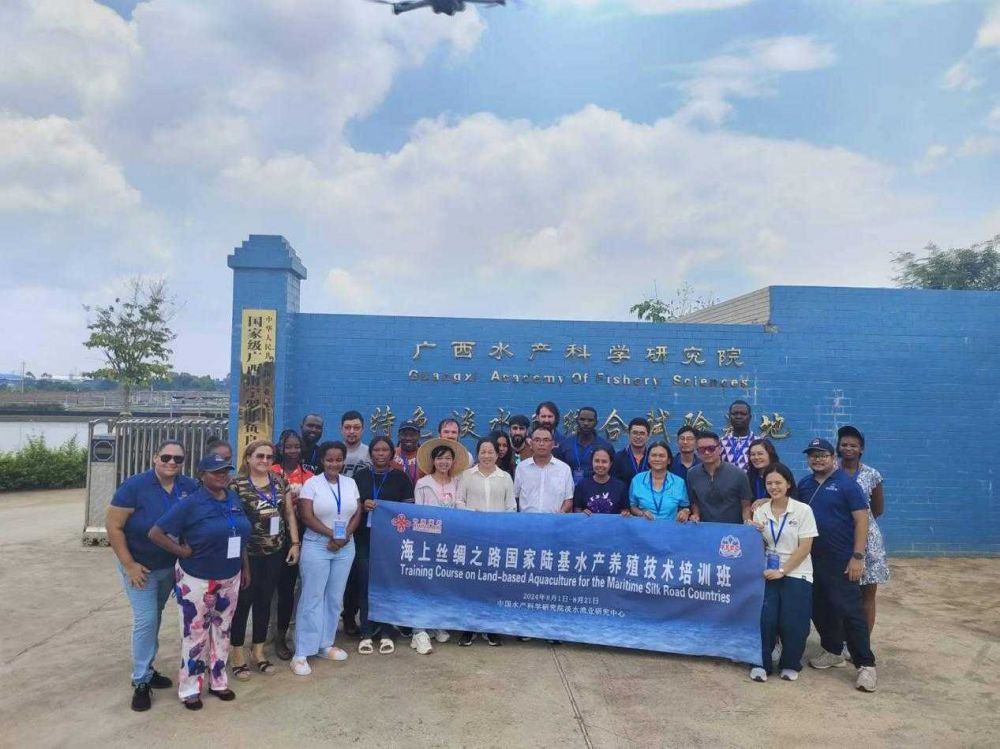 2024年8月17日,由商务部主办、中国水产科学研究院淡水渔业研究中心承办的“海上丝绸之路国家陆基水产养殖技术培训班”到广西水产科学研究院武鸣基地(特色淡水鱼综合试验基地)参观交流。基地相关负责同志陪同并向培训班介绍基地相关情况。