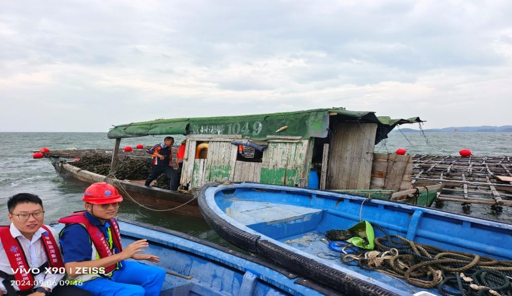 9月9日,台风过境后,团队成员前往大蚝种质资源安置点察看,经现场确认,野生大蚝种质未发现开口死亡和滑落海底的情况,生长状况良好。此时,看到这些“蚝宝贝”安然无恙,团队成员们悬着的心才得以放下。经与运河集团和管理方商议,决定待吊养海区水质稳定后再将蚝种转移,以保证种质的安全。