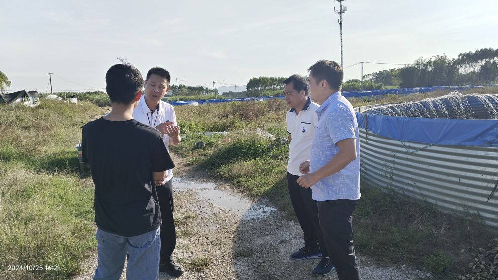 在贵港市大岭乡,科技人员来到陆基圆池养殖基地,与基地技术员详细了解设施设备运行、养殖品种、养殖技术、养殖尾水处理、销售价格等情况,并表示基地因地制宜,发展节地、节水的新型设施渔业养殖,探索种养结合模式值得肯定,并就养殖水体处理、养殖品种选择、养殖尾水处理以及陆基圆池设施设备建设等进行了指导。