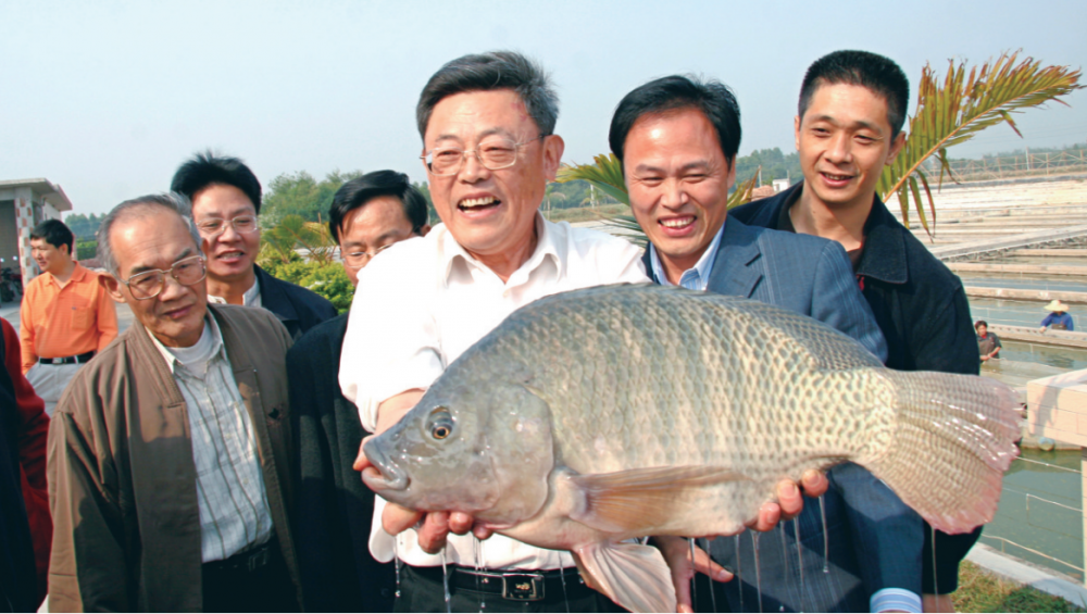 李思发(前排中)团队培育的“新吉富罗非鱼”新品种是我国引进鱼类中首例具有自主知识产权的选育品种。资料图