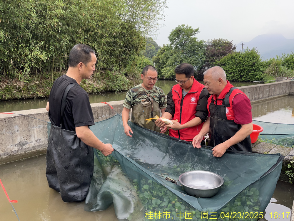 4月22日-24日,为有效应对当地金边鲤苗种供应不足,我院水产科技先锋队及乡村科技特派员,到桂林市灌阳县开展金边鲤鱼苗繁育生产技术指导。