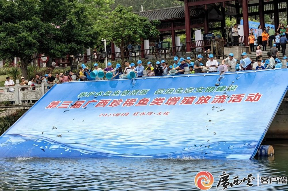 养护水生生物资源,促进生态文明建设。4月26日,第三届广西珍稀鱼类增殖放流活动在河池市大化瑶族自治县举行,向红水河增殖放流14万尾珍稀鱼类。